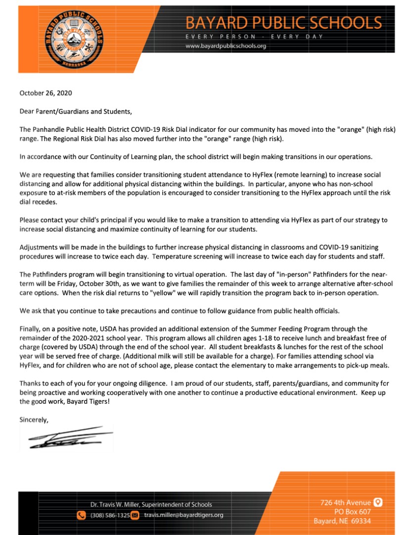 The Panhandle Public Health District COVID-19 Risk Dial indicator for our community has moved into the "orange" (high risk) range. Please read the attached letter for important information regarding transitions the schools will be making to our operations.