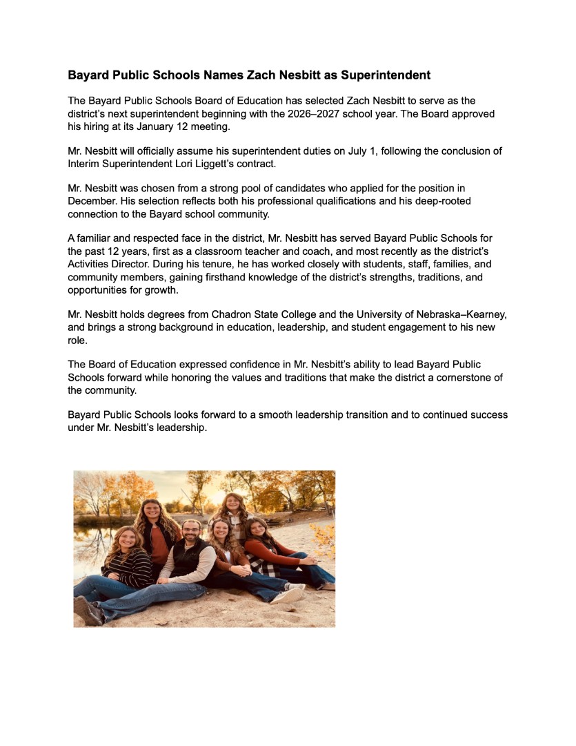Bayard Public Schools Names Zach Nesbitt as SuperintendentJanuary 29, 2026 Launch the media gallery 1 player