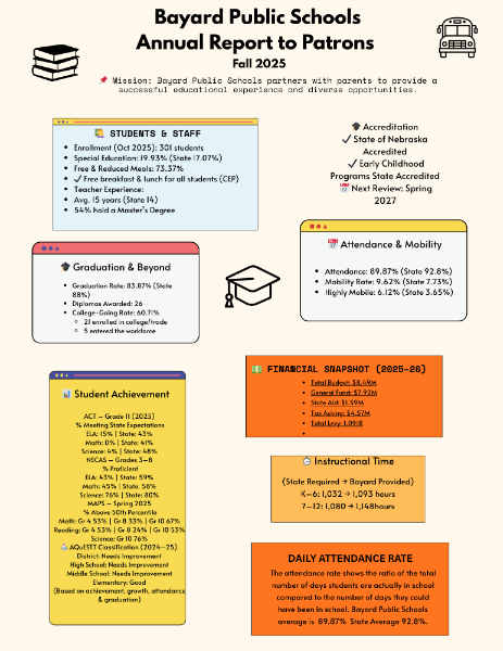 Bayard Public Schools Annual Report to Patrons Fall 2025December 18, 2025 Launch the media gallery 1 playerBayard Public Schools Annual Report to Patrons Fall 2025 Please click on the images to access the full report.